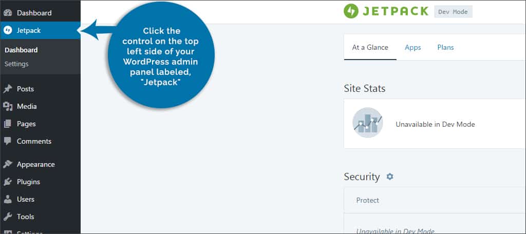 Step 1: Click the control on the top left side of your WordPress admin panel labeled, “Jetpack.”
