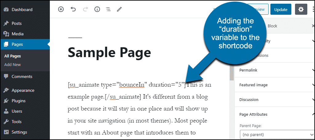 This is where being able to animate text without knowing CSS comes in handy. The code required to configure the duration and delay time is replaced by simple shortcode variables. (The CSS isn’t actually replaced, of course, we just don’t have to deal with it.)