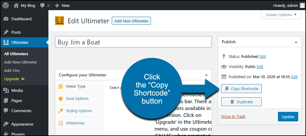 To do this, go back to “All Ultimeters” in the WordPress admin navigation and click the “Edit” link for your meter.