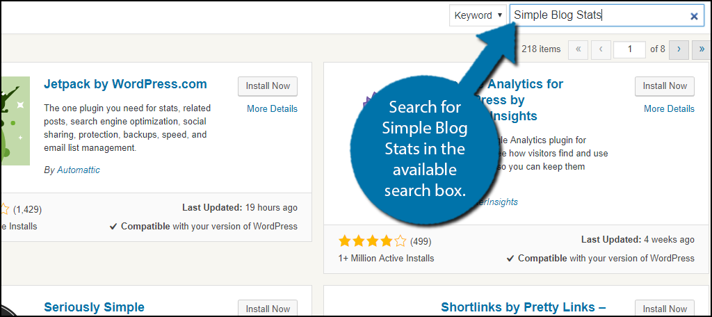 Scroll down until you find the Simple Blog Stats plugin and click the “Install Now” button and activate the plugin for use.