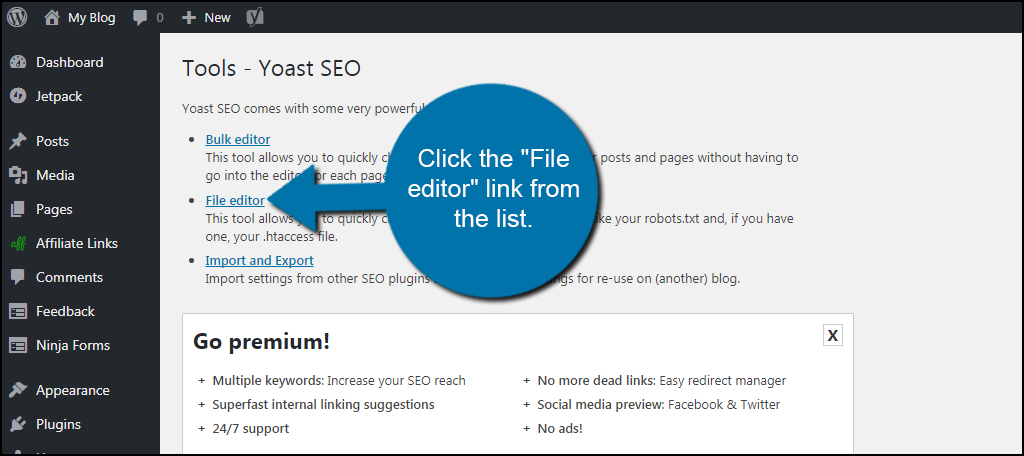 Go to the “SEO” area on the left and click “Tools.” You may have to turn on the advanced options from the Yoast dashboard to see this ability.