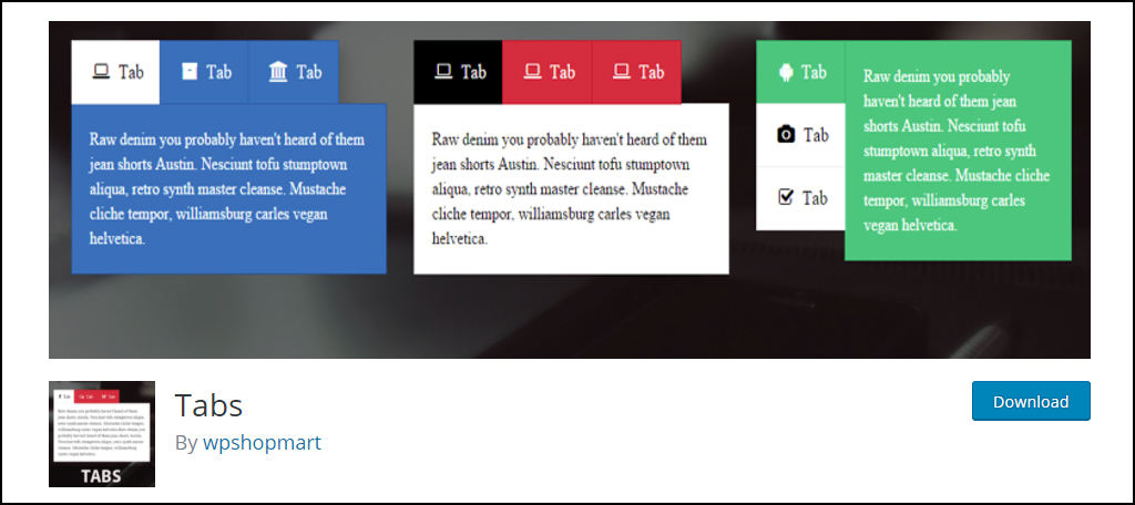 Shortcodes Ultimate is an incredibly useful plugin to have installed. Among the 50+ shortcode elements it adds to WordPress, is a good tab creator. Although it doesn’t have the customization options that other plugins, it is a simple system and is easy to use.