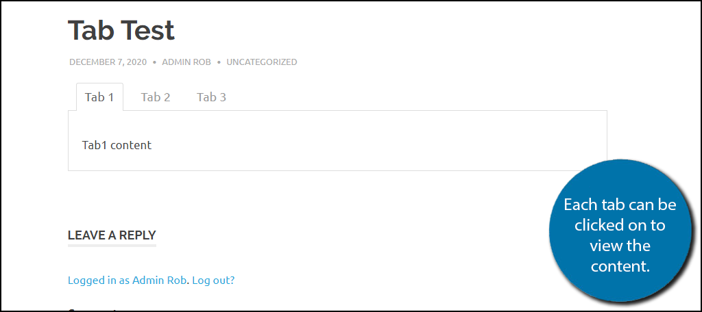 Notice in the example that between Tab 1 and Tab 2 that there is normal text. Any text that is located between the two shortcodes is the text that will be found within the tab.