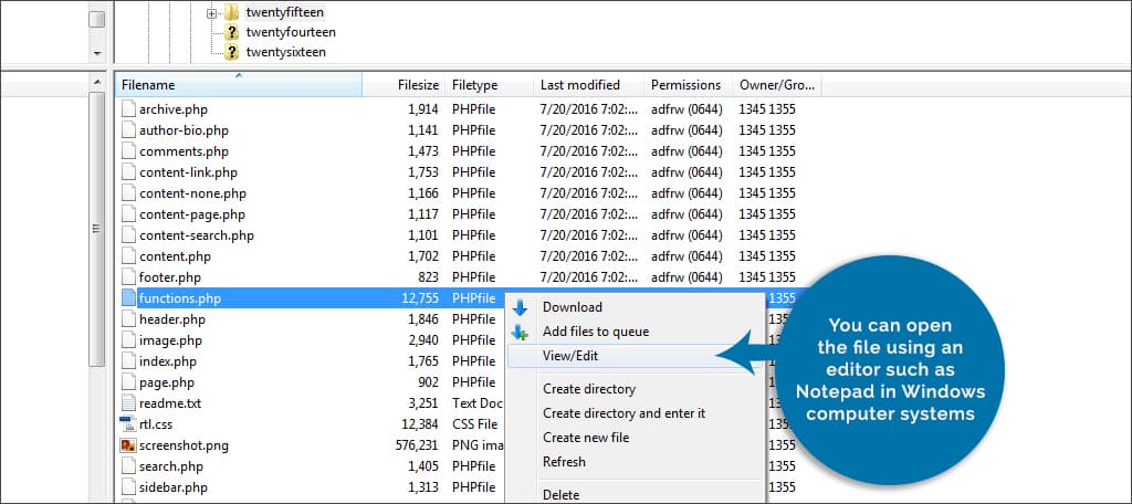Perhaps one of the best methods is to use FileZilla. Since you’ll be modifying files directly, a simple upload of a file may be all that’s needed to fix the site should something go wrong. For instance, let’s say that something happened and the functions.php file was preventing your theme from operating correctly. You can easily upload the copy of the functions.php file to overwrite the one you edited. This would undo any changes you made.