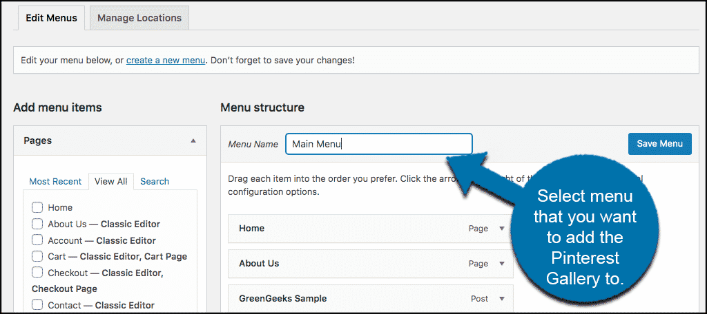 Once on the menu creation page, select the menu that you want to add the Pinterest gallery page.