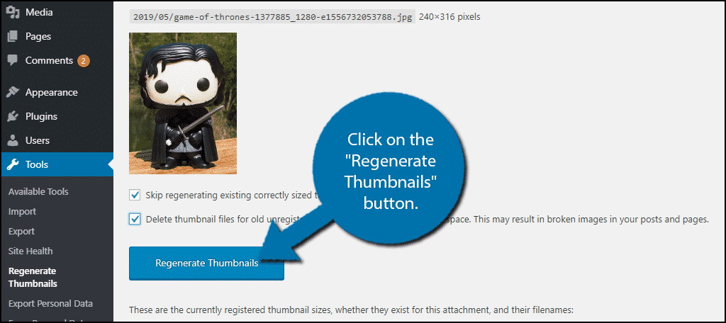 You will now be brought to the Regenerate Thumbnails tools page. You should see the image you selected at the top.