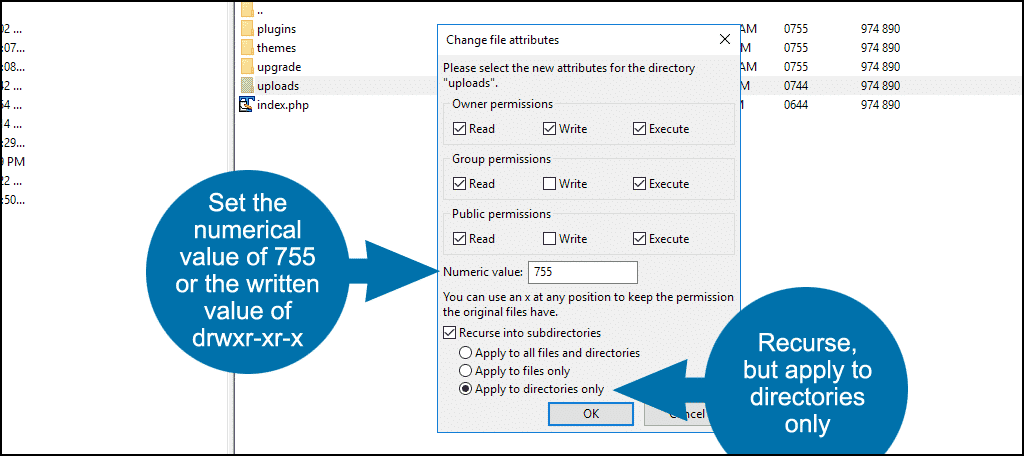 We’re also going to set “Recurse into subdirectories.” This is because we want to apply this change to all the directories under /upload. Also select “Apply to all files and directories” because we want to change permissions on all the image files in the directories as well.