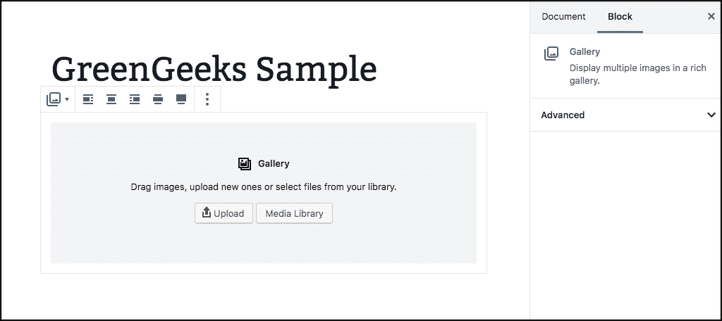 When the block has been added you will see the Gallery block added to your post or page area. Now, you can upload images one-by-one from your computer or select the pre-uploaded pictures from your media library.