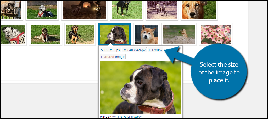 Pictures will now appear that match your keyword. Click on the image you would like to use. Now select the image size, small, medium, or large. The picture will be saved to the server (as long as you changed the settings) and be inserted into your post or page.