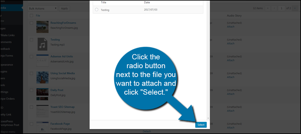 A new window will appear displaying a list of any audio files WordPress detects. Click the radio button next to the file you want to attach and click “Select.”