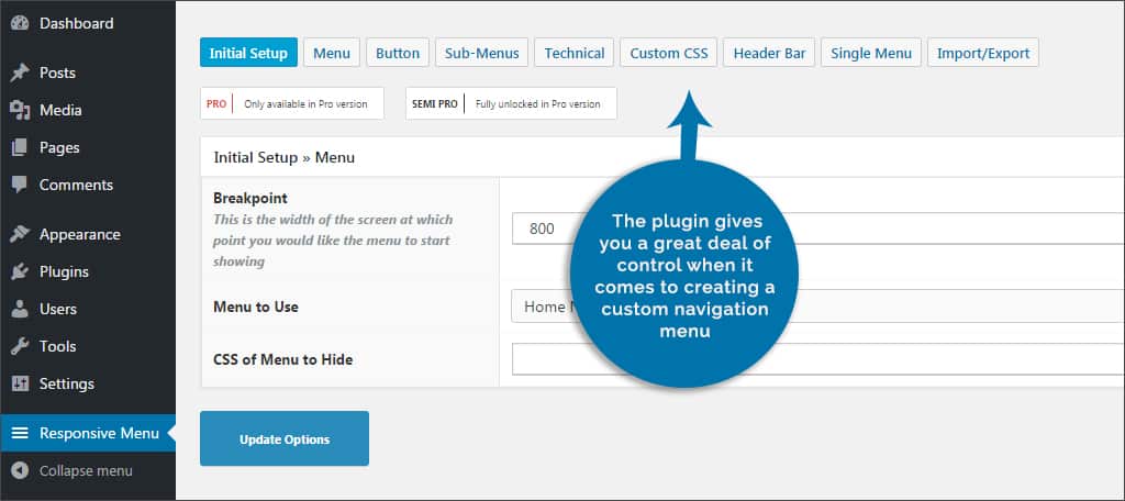 Initial Setup: In this area, you can change when the menu becomes mobile-friendly in terms of pixel width. It also has the ability to use a custom menu that you create in WordPress if you want something else to show instead.
