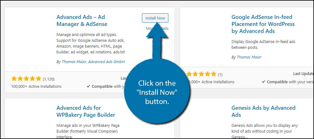 Scroll down until you find the Advanced Ads plugin and click on the “Install Now” button and activate the plugin for use.