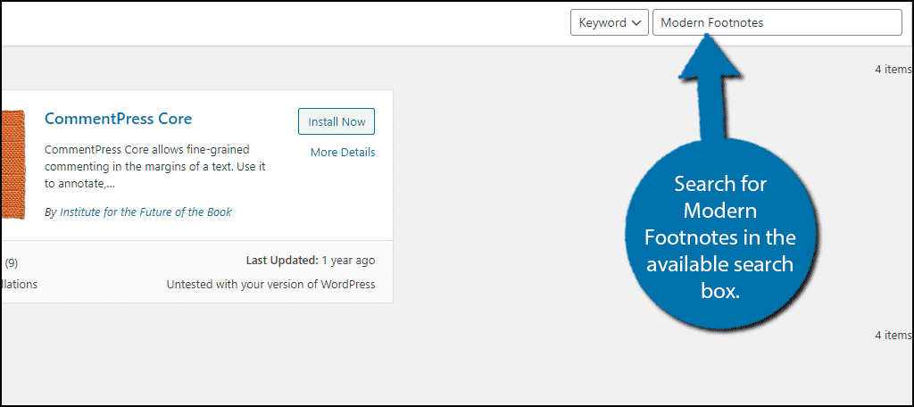 Scroll down until you find the Modern Footnotes plugin. Click on the “Install Now” button and activate it for use.