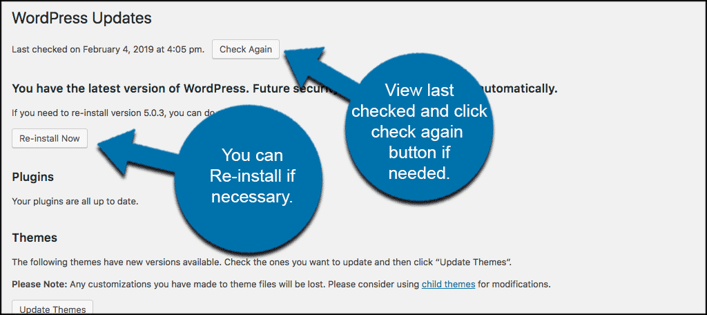 Directly below the “Check Again” button, you’ll see a “Re-install Now” button. This allows you to reinstall the current version of WordPress. More than likely you can ignore this button, as it is only helpful for those who are restoring their website from a backup, and they may need to re-install the latest version of WordPress core software.