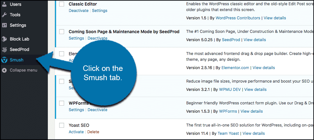 Once the plugin has been installed and activated, you can head over to the main setup page by clicking on the “Smush” tab that will now appear in the left-hand menu of your WordPress admin dashboard.