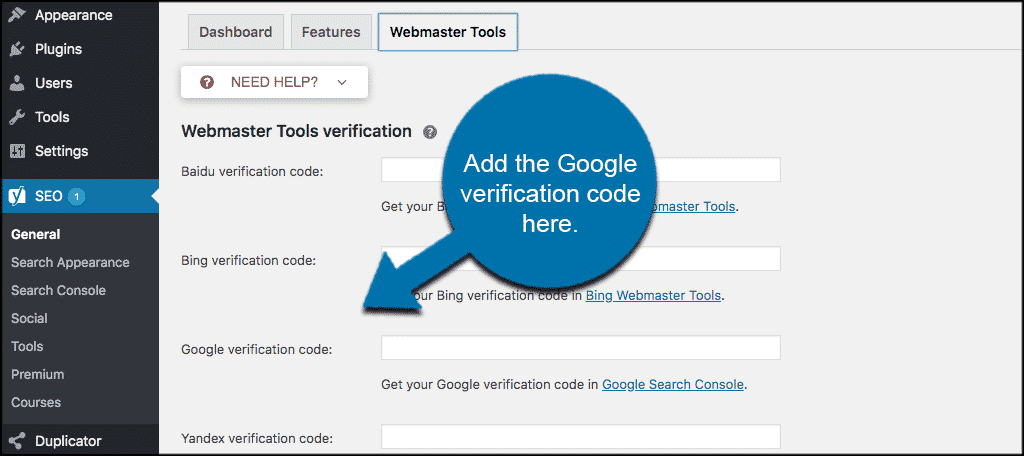 To access that click on the “Webmaster Tools” tab and find the verification code field located directly beneath it. Go ahead and add the code there.