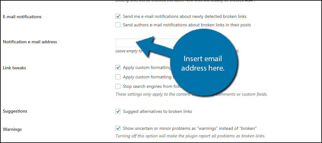 One of the best systems this plugin offers is email notification. I would recommend setting up email notifications. The plugin will send an email every time it finds a broken link. You need to act fast when this happens, so keeping multiple ways of being notified is very important.