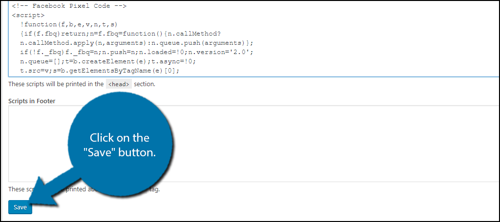 Paste the code into the header text box. Click on the “Save” button to activate the Pixel on your website.