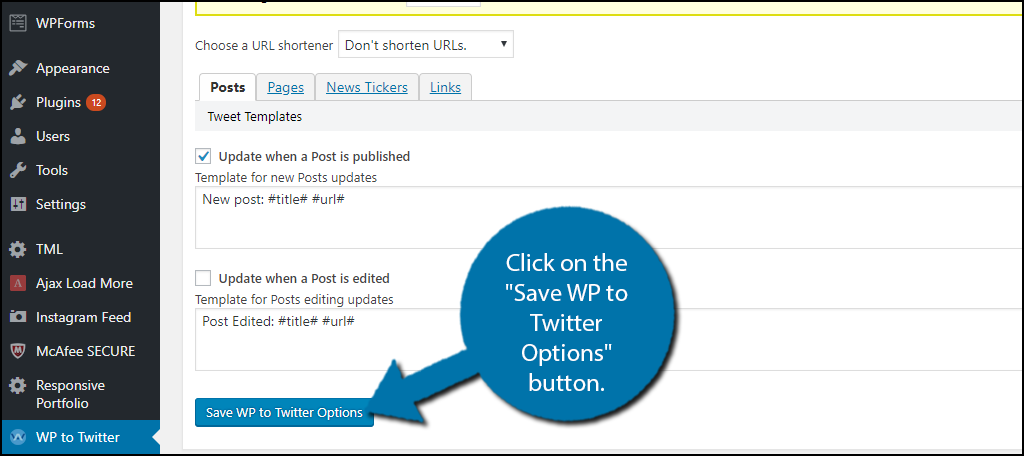 By default, your tweet will say the title of your post and the URL of the post. You can edit the message to whatever you want, but remember the character limit on tweets. There will also be an option to send a tweet when a post is edited. This is really important if there is a critical mistake that was fixed. The choice is up to you. Click on the “Save WP to Twitter Options” button when you are done.
