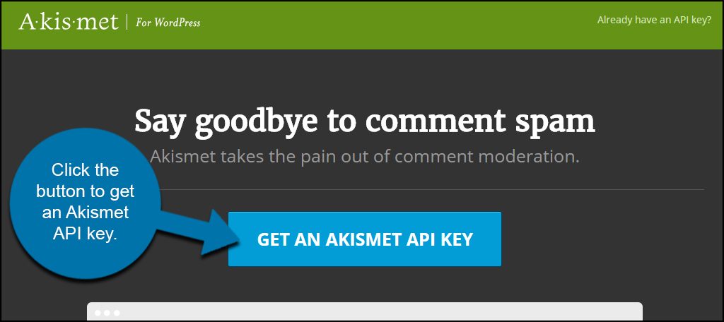 Akismet requires the use of an API key to connect to its database. After activating the plugin, you’ll see a big button across the top of the plugins to “Set up your Akismet account.”