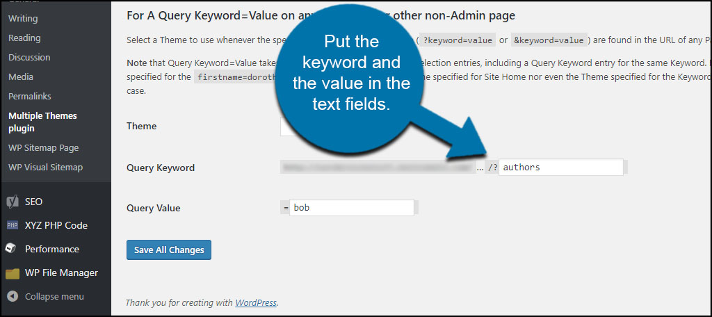 And lastly, you can change the theme according to keyword values. This is done as the theme looks for variables in the values of the posts or pages. For example, if you use a custom post type to show off authors, you might have something like “author=bob” on profile pages of your site. In this case, you would put the keyword and the value in the text fields. So, I would have “authors” in the keyword and “bob” in the value.