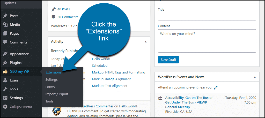 In the left column navigation, mouse over the “GEO my WP” link and click the “Extensions” link.
