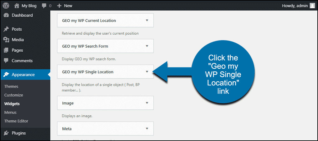 In the “Available Widgets” list, find “Geo my WP Single Location.”