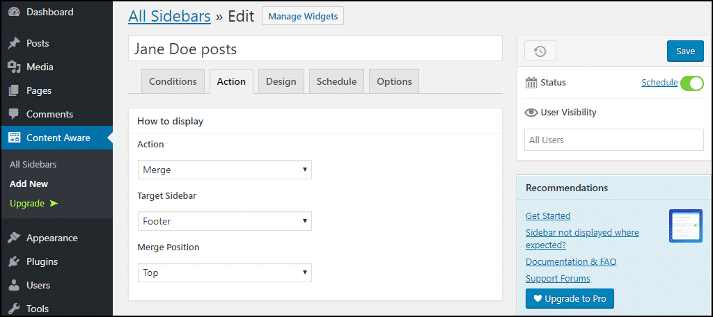 By default (if we do not enter anything in the “Posts / Blog” field), the sidebar will show up on all posts and pages written by Jane Doe because she’s the “AND” subject.