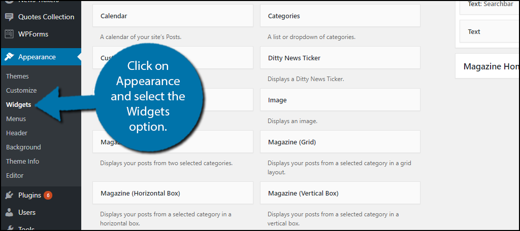 On the left-hand admin panel click on Appearance and select the Widgets option. This will pull up the widgets page.
