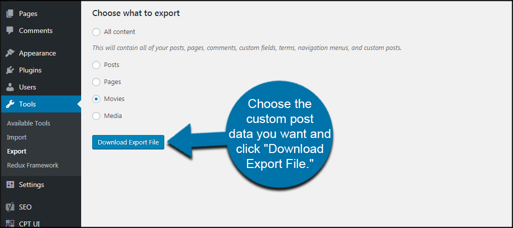 Choose the custom post data you want and click “Download Export File.”