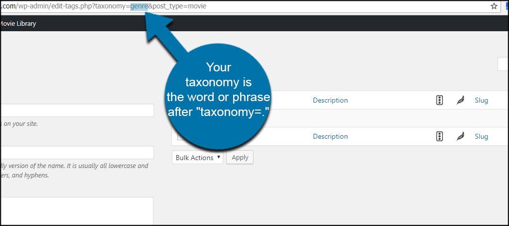 After clicking the genres section, I can find the taxonomy of the custom post types in the address bar. This is displayed in the same fashion as the post type. Your taxonomy is the word or phrase after “taxonomy=.”