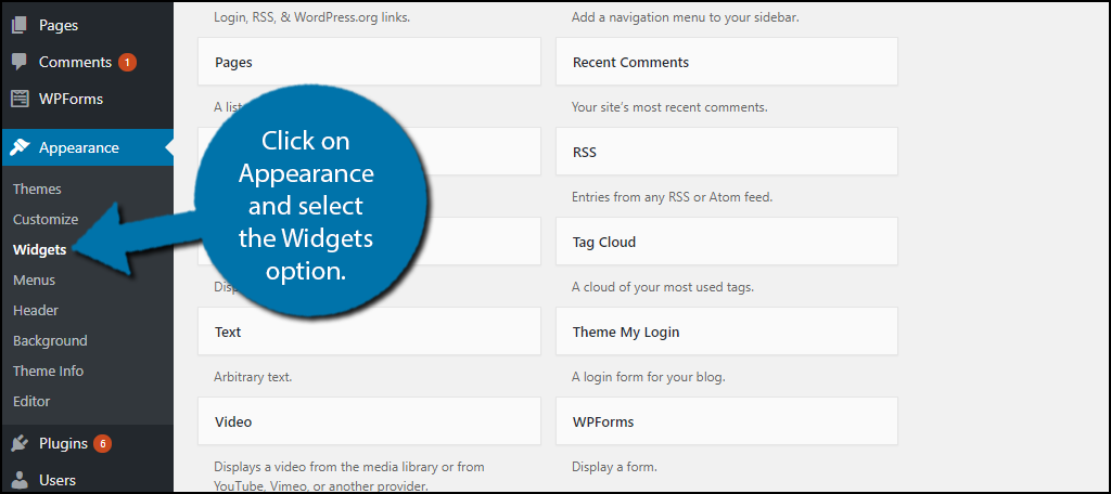 On the left-hand admin panel click on Appearance and select the Widgets option. This will pull up the widgets page.