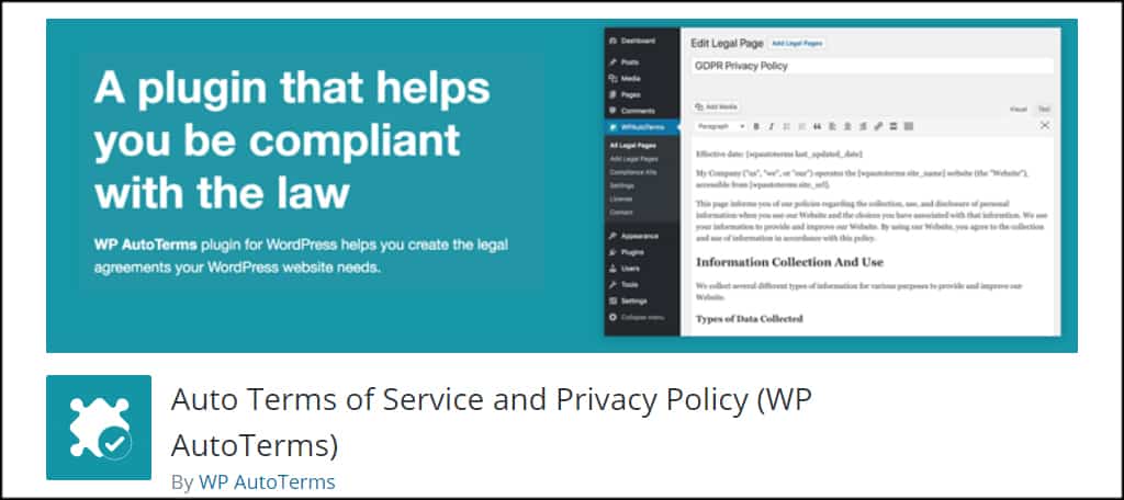 The plugins helps create a cookies policy, terms of service and a privacy policy for your site. You can also use the tool to govern over any other legal documents you might have outside of these top three.