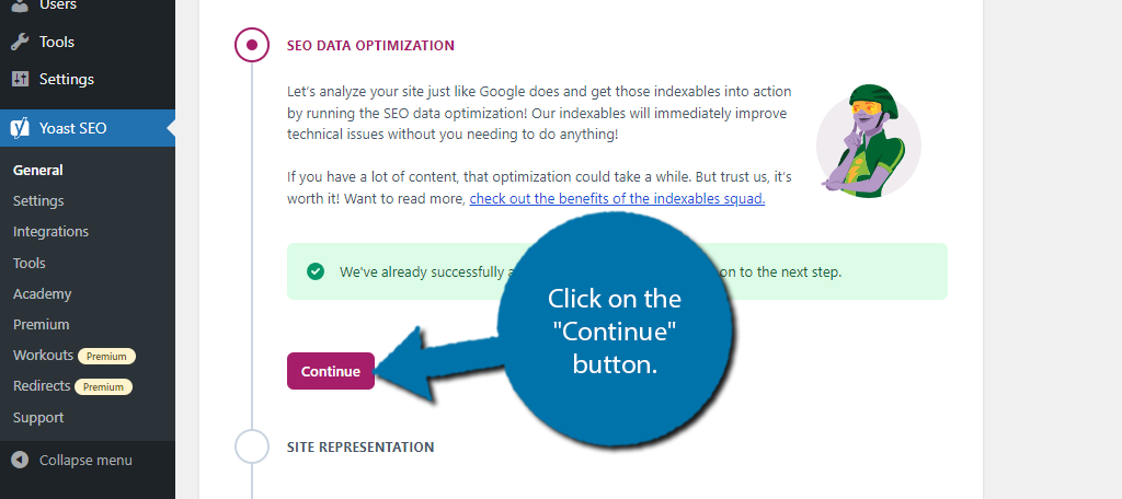 Upon activation, you should see one new Yoast SEO notification. This notification will tell you to optimize your SEO data, which will help Yoast run better and give you the best results. It will also boost the performance of your website to make sure it is loading pages quickly.