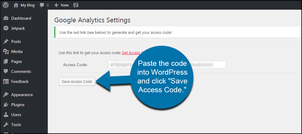 Paste the code into WordPress and click “Save Access Code.”