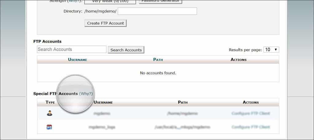 In this next window, scroll down until you find the FTP account you wish to use. Note: If you don’t have one specifically for the website you wish to access, you may have to create an account.