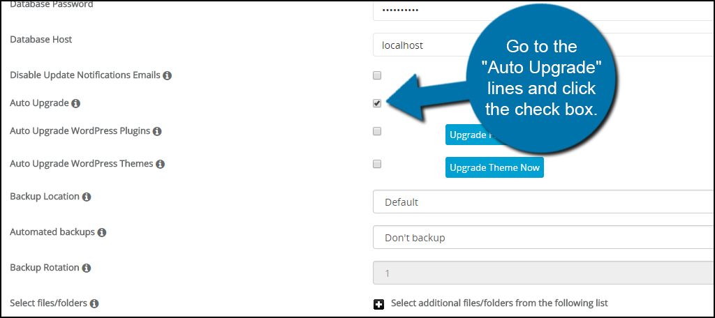 Go to the “Auto Upgrade” lines and click the checkbox. You can also set WordPress plugins and themes to update automatically from this area as well.