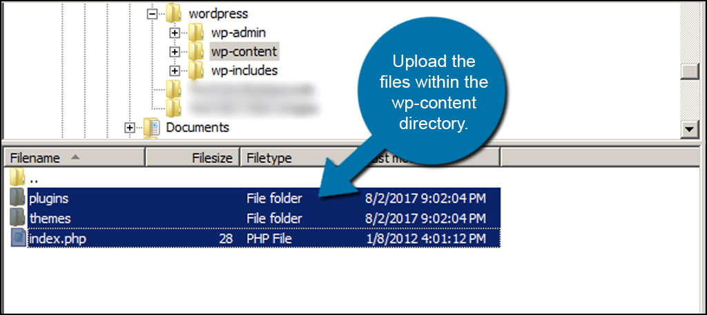 Now, upload the files within the wp-content directory. You will need to overwrite existing files in this directory. This is because the content folder will contain information about your site and you don’t want to delete any of the files that have been created over time. The new files you’re uploading are part of the new version of WordPress and will not impact your site’s actual content.