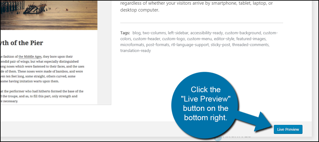 A new window will open providing you with the details of the theme you selected. Click the “Live Preview” button on the bottom right.