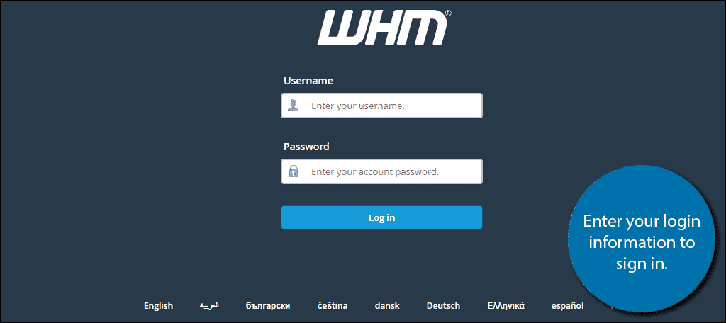 This will take you to the WHM login screen. Enter your login information to sign in.