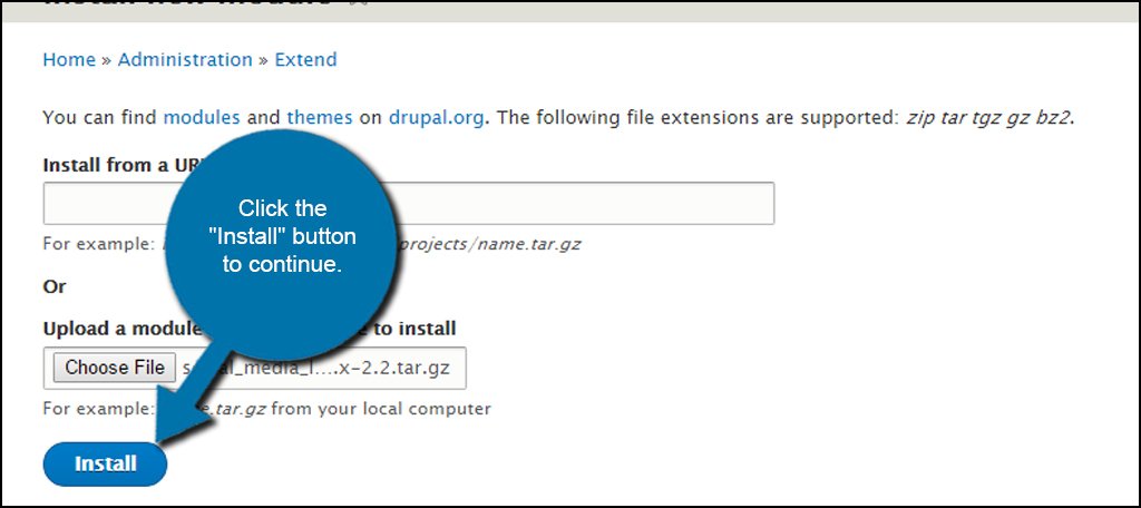 Since we’ve saved the module to the computer system, ignore the “Install from a URL” field. However, you can enter the exact address of a module here should you find one. This may save a bit of time since you won’t have to download and then upload the file.
