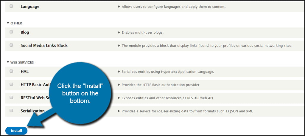 Even though you “installed” the module into Drupal, it’s not actually operational on your website just yet. The above step simply added it to the library of things you can do on your website. Next, you will need to actively install it for the site.