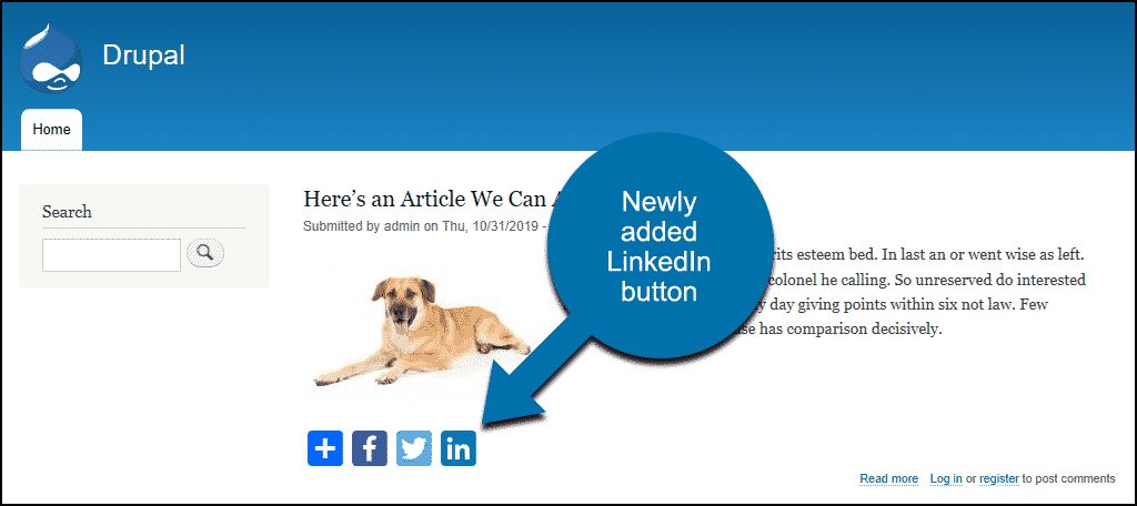Once the AddToAny Share Buttons module is installed and enabled, a few sharing buttons will appear on your articles and pages.