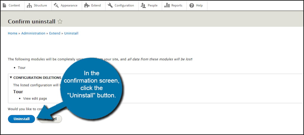 In the confirmation screen, click the “Uninstall” button. This will finish the removal of the module from your website.