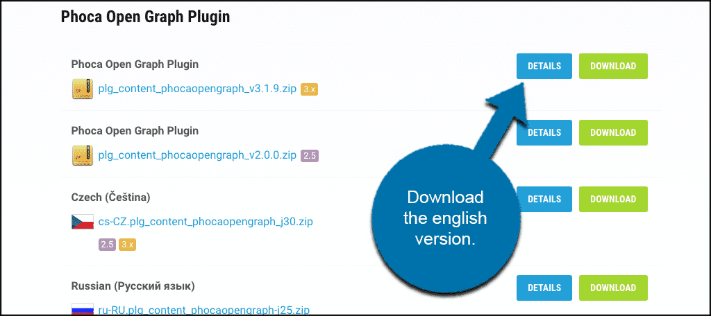 When you click on the download button, you will be taken to the Phoca Open Graph main page on their website. Here you will see a selection of og downloads. In our case, we want to download the latest English version of the plugin to our machine. So we are grabbing that one.