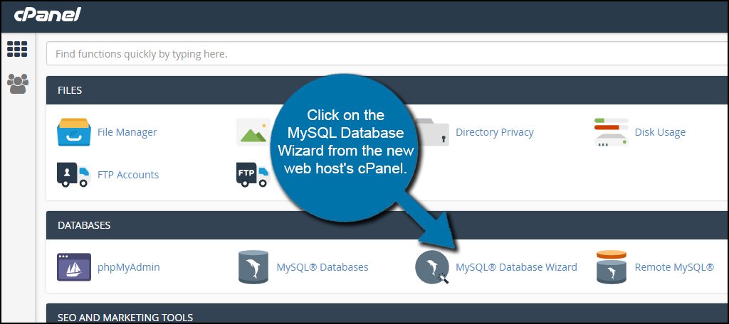Click on the MySQL Database Wizard from the new web host’s cPanel. You’ll then follow the steps provided to create a new database.