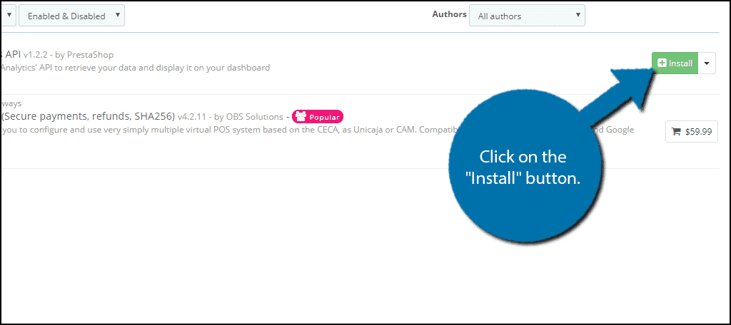 Find the module you recently uploaded in the list and click on the green “Install” button, to get it installed on your website.