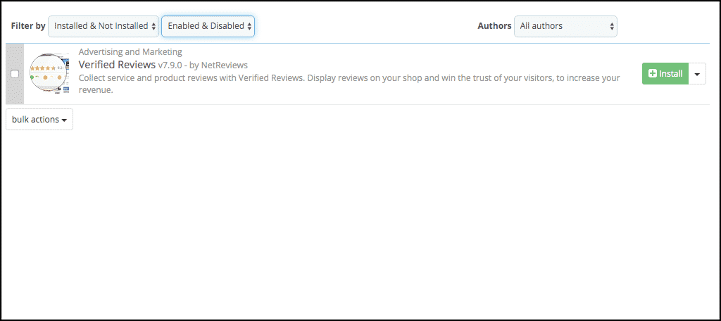 Now that the Verified Reviews module has been installed, you need to actually activate it. Scroll down a little to your “Modules List.” You will see all your modules in this list. You can search your uploaded modules using a combination of four different filters. They include:
