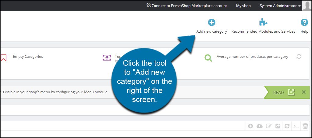 From the PrestaShop dashboard, go to the Catalog area and click, “Categories.”