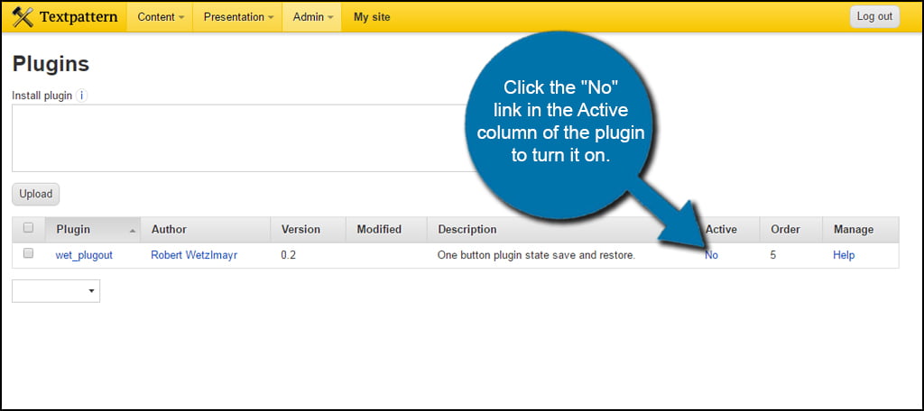 In Textpattern, click the “Admin” tab at the top and select “Plugins.”